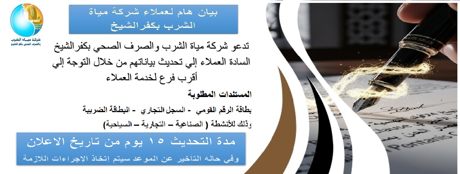 لقد حبانا الله بنعمة الماء أصل الحياة، وأنعم على مصرنا الغالية بنهر النيل شرياناً للوجود. ومن هذا المنطلق، تلتزم شركة مياه الشرب والصرف الصحي بكفر الشيخ (إحدى الشركات التابعة للشركة القابضة) بمسؤوليتها الوطنية والمهنية لتقديم أفضل الخدمات للمواطنين.